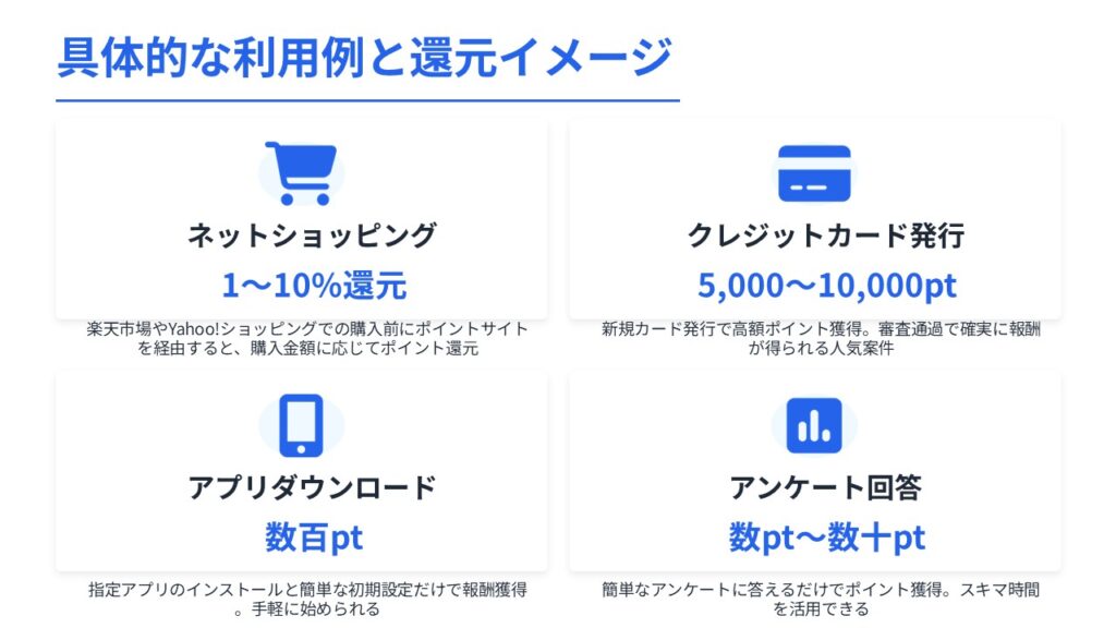 このように、日常の買い物や申込みがそのまま“お得”につながるのがポイントサイトの魅力です✨