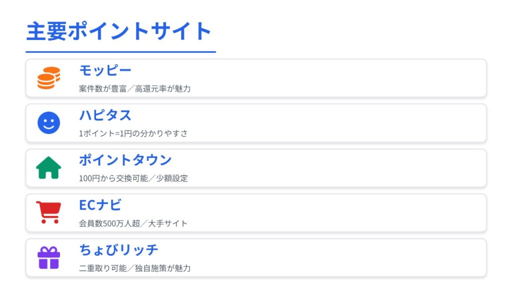 | モッピー | 案件数が多く高還元率。ゲーム感覚で貯まる。 |